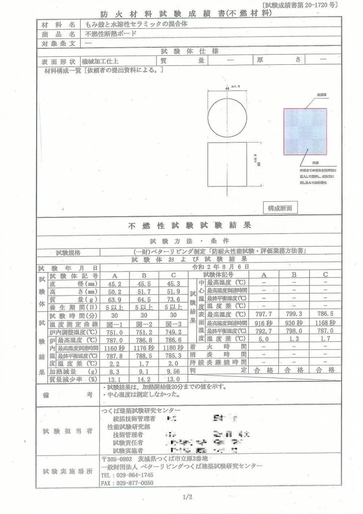 報告書をご確認頂ければと思いますが、750℃の加熱炉の中で30分間全く燃えることなく形状を維持し、加熱後の重量も86%残っております。この試験規格に合格した断熱材は、世界でも前例が無く、全く燃えない断熱材は世界初となります。