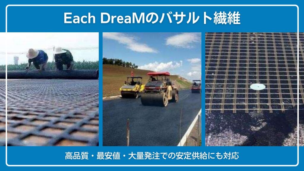 当社は中国に強力なネットワークを持ち、高品質のバサルト繊維を業界最安値でご提供可能です。バサルト繊維は高価(ただし炭素繊維と比較すると大幅に安価)なため、導入を見送られている企業様も多いと思いますが、Each DreaMなら格安にてご提供できますので、この機会にぜひご検討ください。